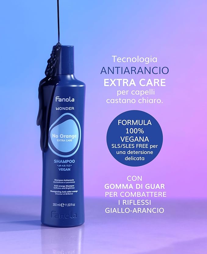 Fanola Wonder No Orange Shampoo, Neutralizing Orange Highlights Shampoo for Blonde and Light Brown Hair with Immediate Toning Action, SLS/SLES Free and Vegan, 350ml